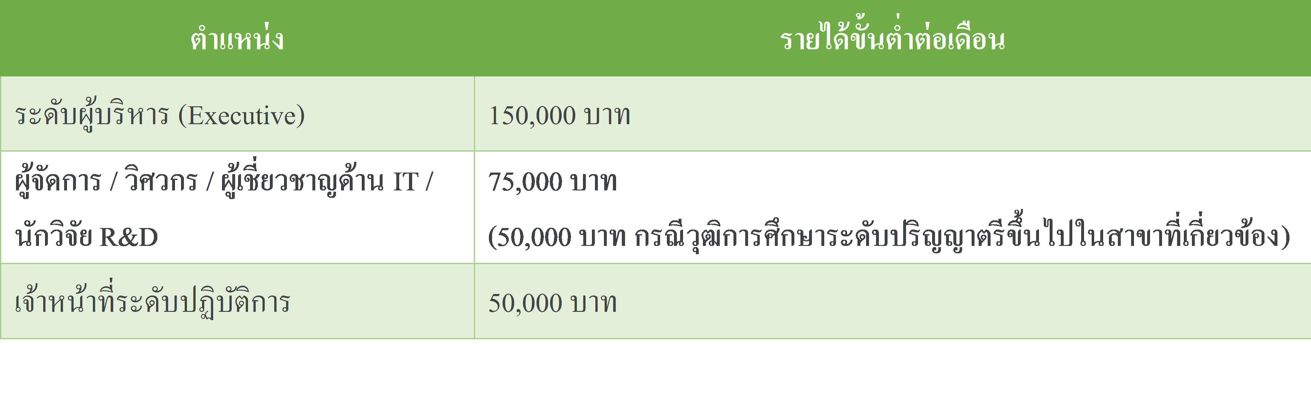 รายได้เฉลี่ยขั้นต่ำต่อเดือนสำหรับบุคลากรต่างชาติ: ได้มีการกำหนดไว้ในแต่ละตำแหน่งดังต่อไปนี้