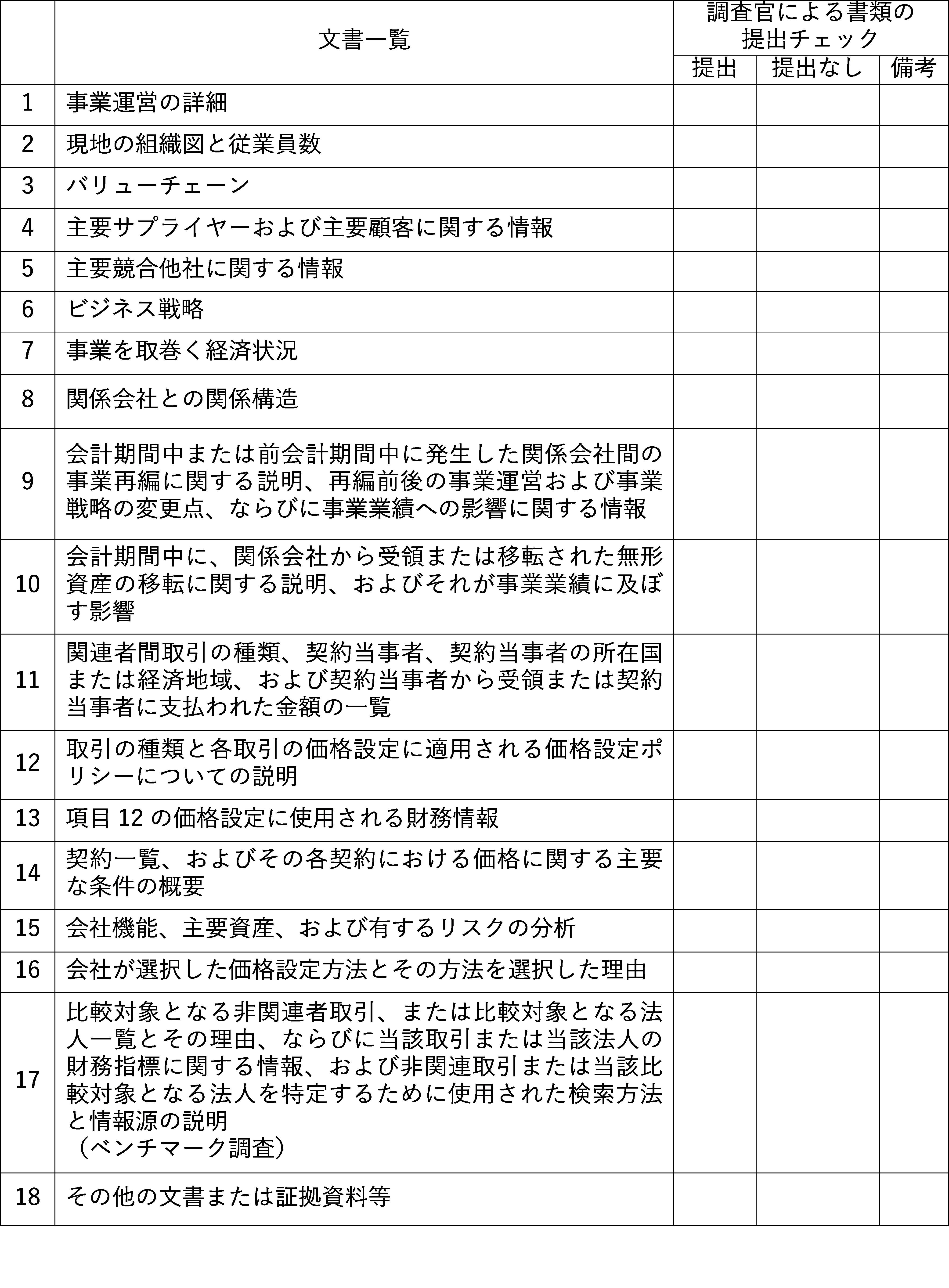 最終的な目的は税収増ではありますが、税務署職員に対する移転価格文書の理解と調査手法の教育も意図しているようです。書簡の翻訳サンプルを以下に記載しますが、すべて法令で要求されている文書になります。
